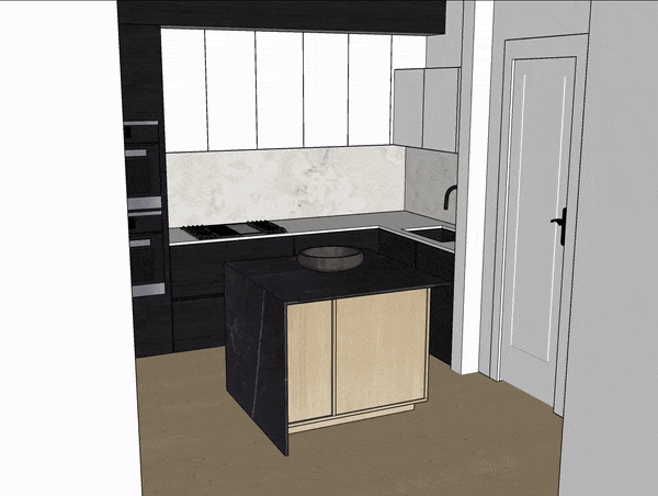Crafted with oak finishes, this custom kitchen island showcases a half waterfall constructed from nero marquina marble. Handcrafted heirloom brass hardware brings a rustic charm into the modern ambiance of this Brooklyn kitchen.
